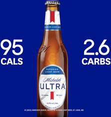 Michelob Ultra Light Beer offers a superior taste for those with an active lifestyle, without compromising on flavor. Containing only 95 calories and 2.6 carbs, Michelob Ultra is a light lager brewed with the perfect balance of hops and grains, producing a light citrus aroma and a crisp, refreshing finish. Our light beer contains only 95 calories, 2.6 carbs, and 4.2% alc./vol. per 12 oz serving. Available in cans and bottles. When life calls for something special, sip on Michelob Ultra Superior Light Beer – the perfect choice for those who go the extra mile to live an active balance lifestyle without sacrificing taste. Brewed for those who understand that it's only worth it if you enjoy it.