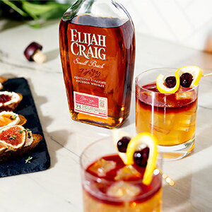 Right, old fashioned cockatil ingredients in background. Left, Eljah Craig small batch bottle with old fashioned on a marble tray.